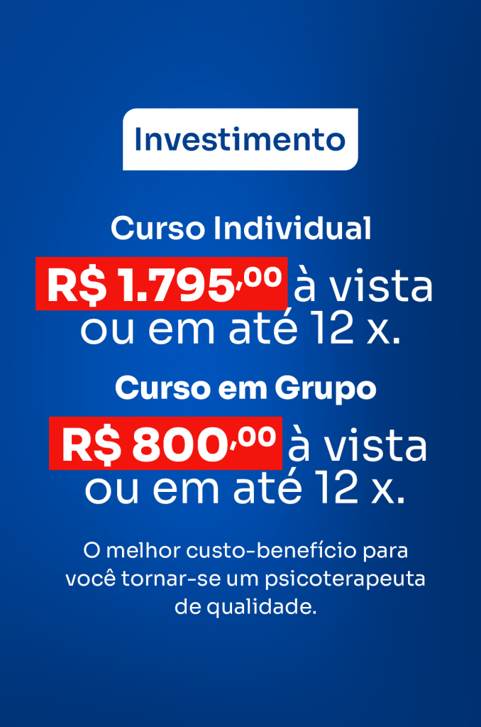 Opção: na modalidade curso individual poderá fazer dois cursos na mesma aula, Psicanálise + Terapia Cognitivo – Comportamental, pagando 50% do valor do segundo curso. Nesse caso, receberá dois certificados: Psicanalista e Terapeuta Cognitivo – Comportamental.